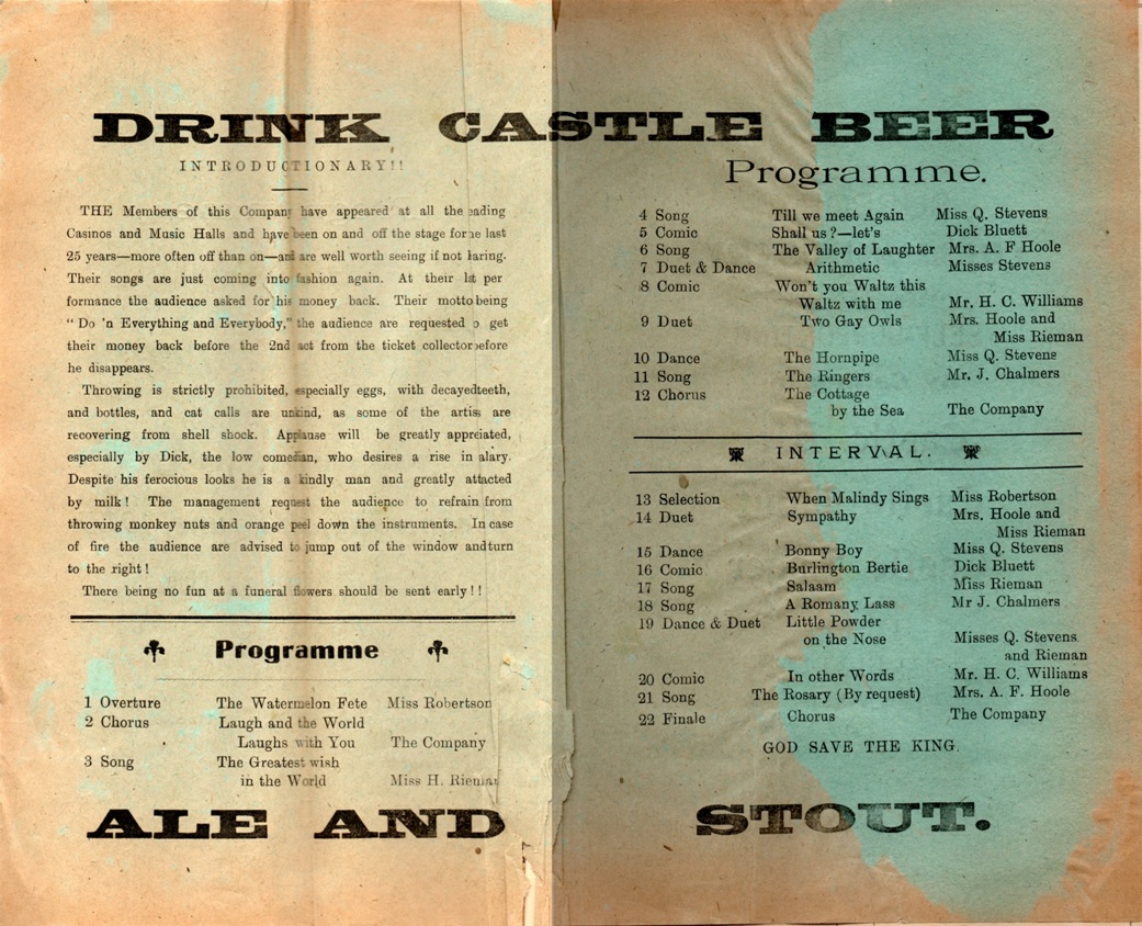 programme: "Drink Castle Beer" at the top, "Ale and Stout" at the bottom.