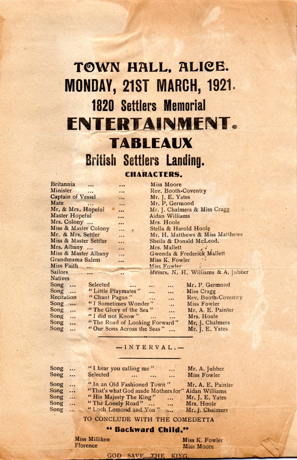 Settlers Memorial Entertainment Tableaux called British Settlers